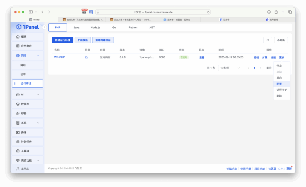 点网站-运行环境,点你创建的运行环境后面的更多,点配置