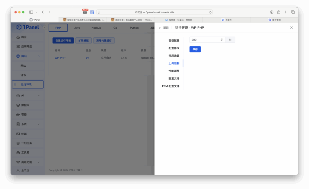 点上传限制,修改数字保存。然后选择重启,是在你创建的运行环境后面更多里选择重启,不是重启服务器。你Wordpress的页面也需要退出再进一下。